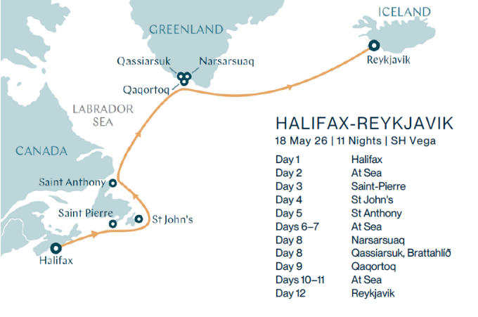 Embark on a luxury cruise from Canada to Iceland, beginning in the vibrant port city of Halifax, Nova Scotia. This captivating voyage aboard the SH Vega takes you across the North Atlantic, exploring remarkable destinations along the way — from the historic charm of St. John’s, Newfoundland, to the icy beauty of Greenland’s fjords, before arriving in Reykjavik, Iceland’s dynamic capital.